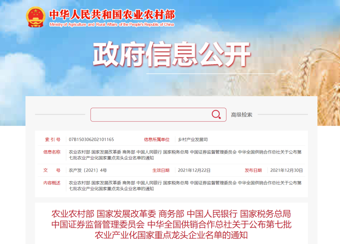 入選第七批農(nóng)業(yè)產(chǎn)業(yè)化國家重點龍頭企業(yè)