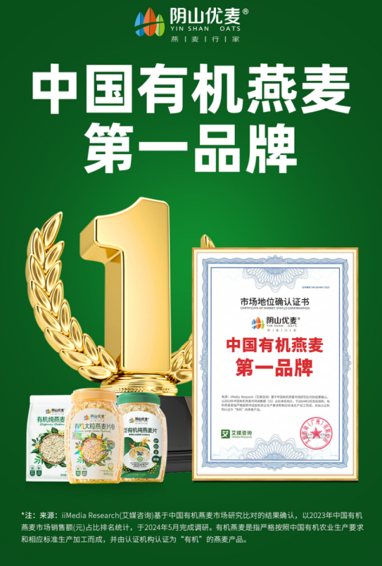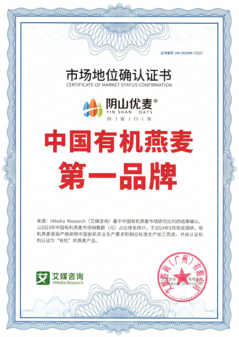 2024年5月,陰山優(yōu)麥獲艾媒咨詢授予的“中國有機燕麥第、一品牌”市場地位認證書,此項認證,是陰山優(yōu)麥品牌發(fā)展史上的一個重要里程碑,標(biāo)志著陰山優(yōu)麥在有機燕麥行業(yè)取得領(lǐng)導(dǎo)地位。